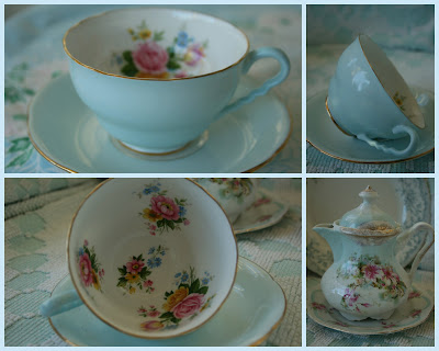 A collage to end my little vintage tea. I think I am still in time for Susans Tablescape Thursday at Between Naps on the Porch but there will be hundreds there before me and I am still a little shy in a crowd in spite of being a 'vintage doll' ! Ha!I am also joining Cindy at My Romantic Home for show and Tell Friday where there is another big party going on.